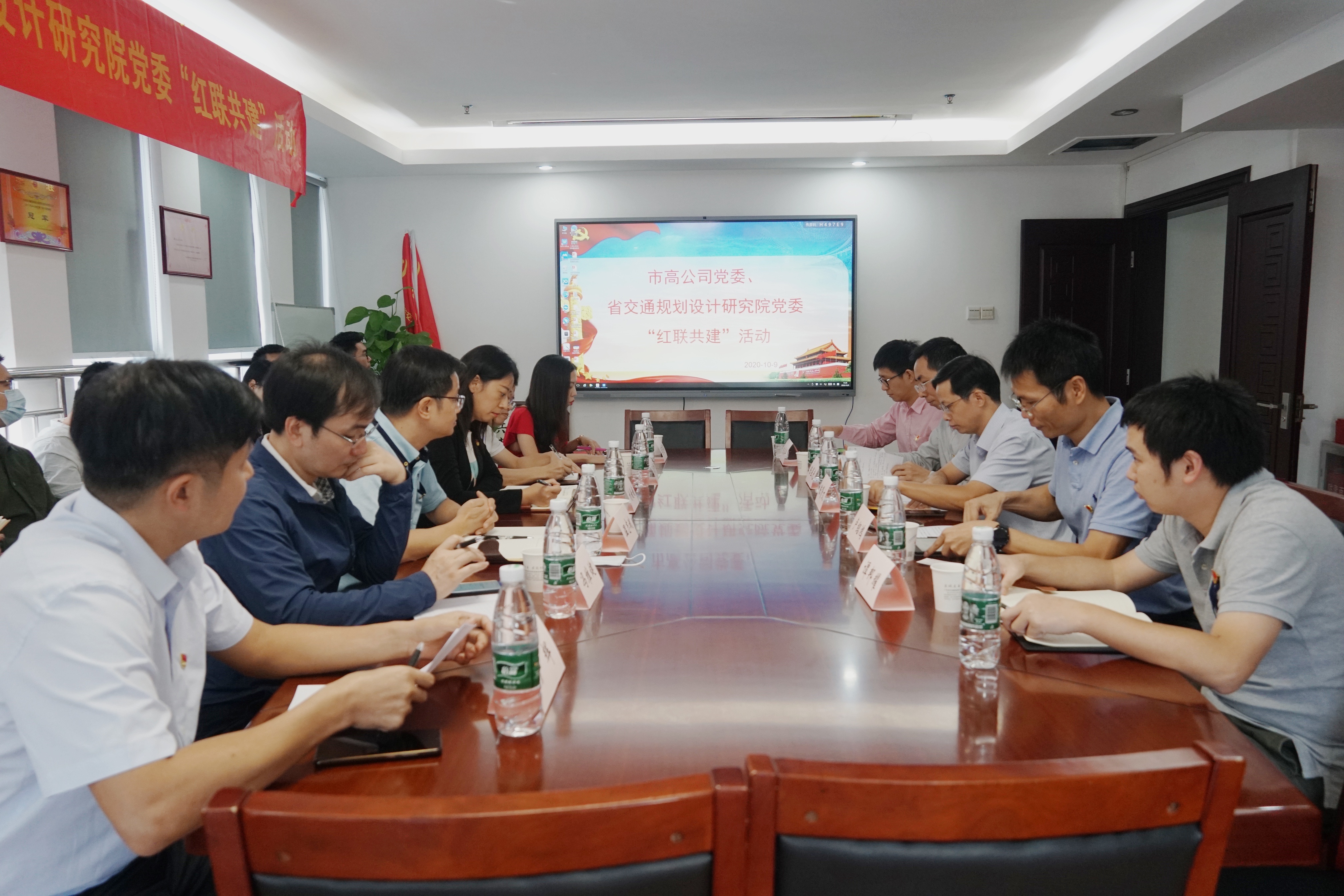 10月9日下午,我司党委与增天高速项目业主单位广州市高速公路有限公司党委,在金星大厦开展了签订“红联共建”协议后的首次活动。市高公司党委书记温志斌,党委副书记、工会主席刘媛媛,总经济师冯维健,总工室、党建工作部、增天高速项目工作组组长卢辉和前期工作组成员以及我司党委副书记、副总经理、工会主席陈贤文,第五设计分院院长卢绍鸿,第五党支部书记、第五设计分院副院长陈星光,我司增天高速项目负责人朱添丰,项目路线总体负责人谭邦耀和项目组成员等参加了本次活动。