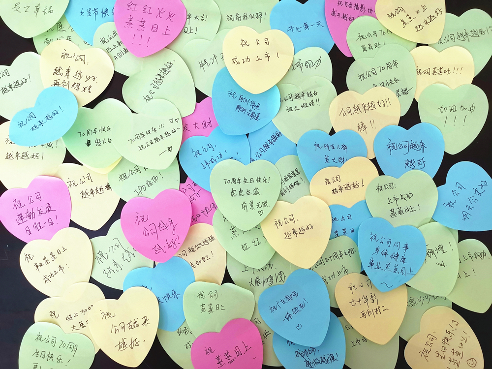 2022年,恰逢公司七十岁生日,公司工会结合“三八”妇女节主题开展了“巾帼献祝福”活动。活动现场,女职工们将自己对公司七十岁生日的祝福亲笔书写在心形便签纸上,并由衷地祝愿公司业务蒸蒸日上,发展越来越好。公司工会在活动现场还给女职工们准备了节日专属小礼物,以此传递对她们的美好祝福。
