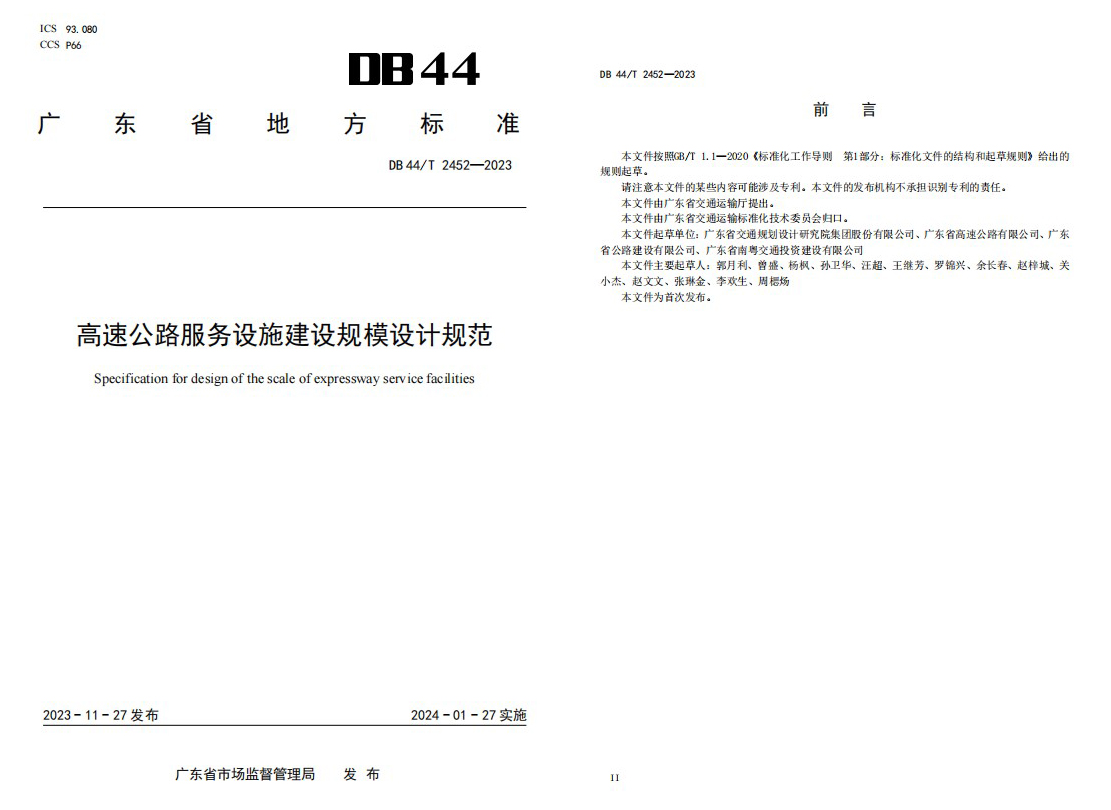 1127日,由公司主编的广东省地方标准《高速公路服务设施建设规模设计规范》(DB44/T 2452-2023)经广东省市场监督管理局批准正式发布,实施日期为2024127日。