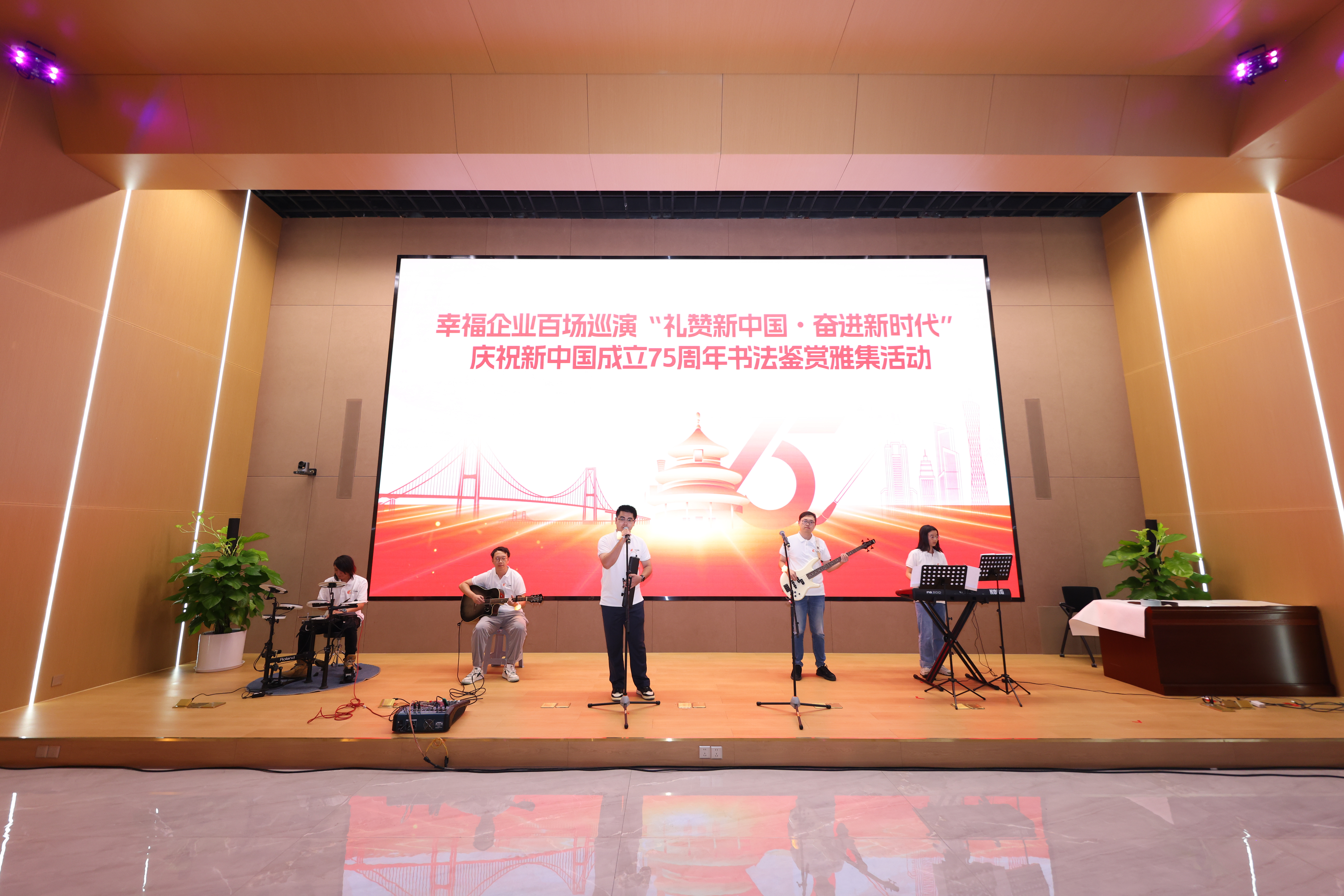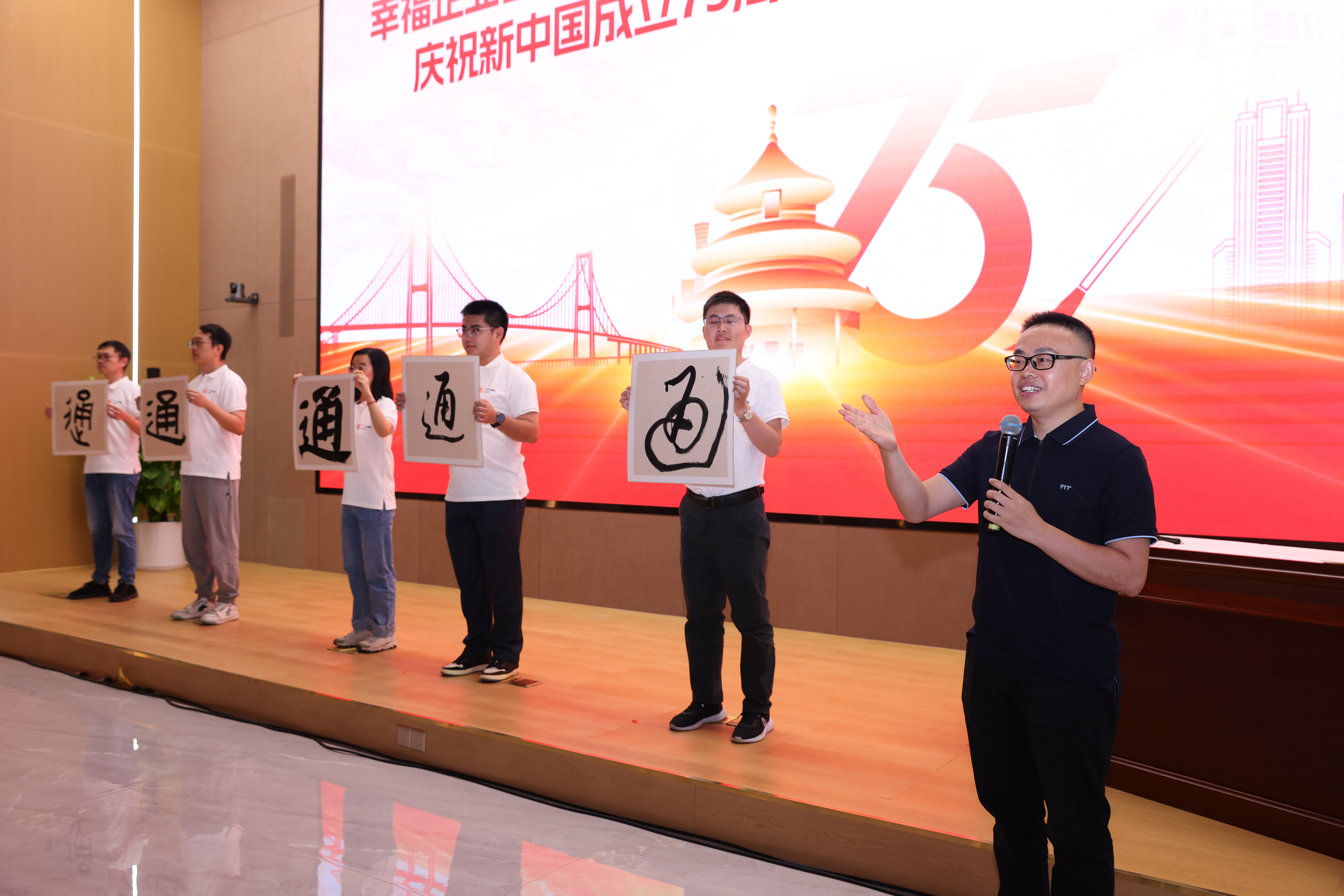 翰墨丹青颂经典,以文会友谱华章。广州美术学院谭文选老师以其深厚的艺术造诣和生动的讲解方式,为现场观众带来了一场别开生面的书法鉴赏授课,使大家从中领略了书法艺术的独特魅力。活动中还穿插了书法献礼环节,谭老师现场挥毫泼墨,创作了一幅寓意深远的书法作品,在祖国母亲75岁生日之际,向祖国献上最真挚的祝福,祝福祖国繁荣昌盛,祝福人民幸福安康。