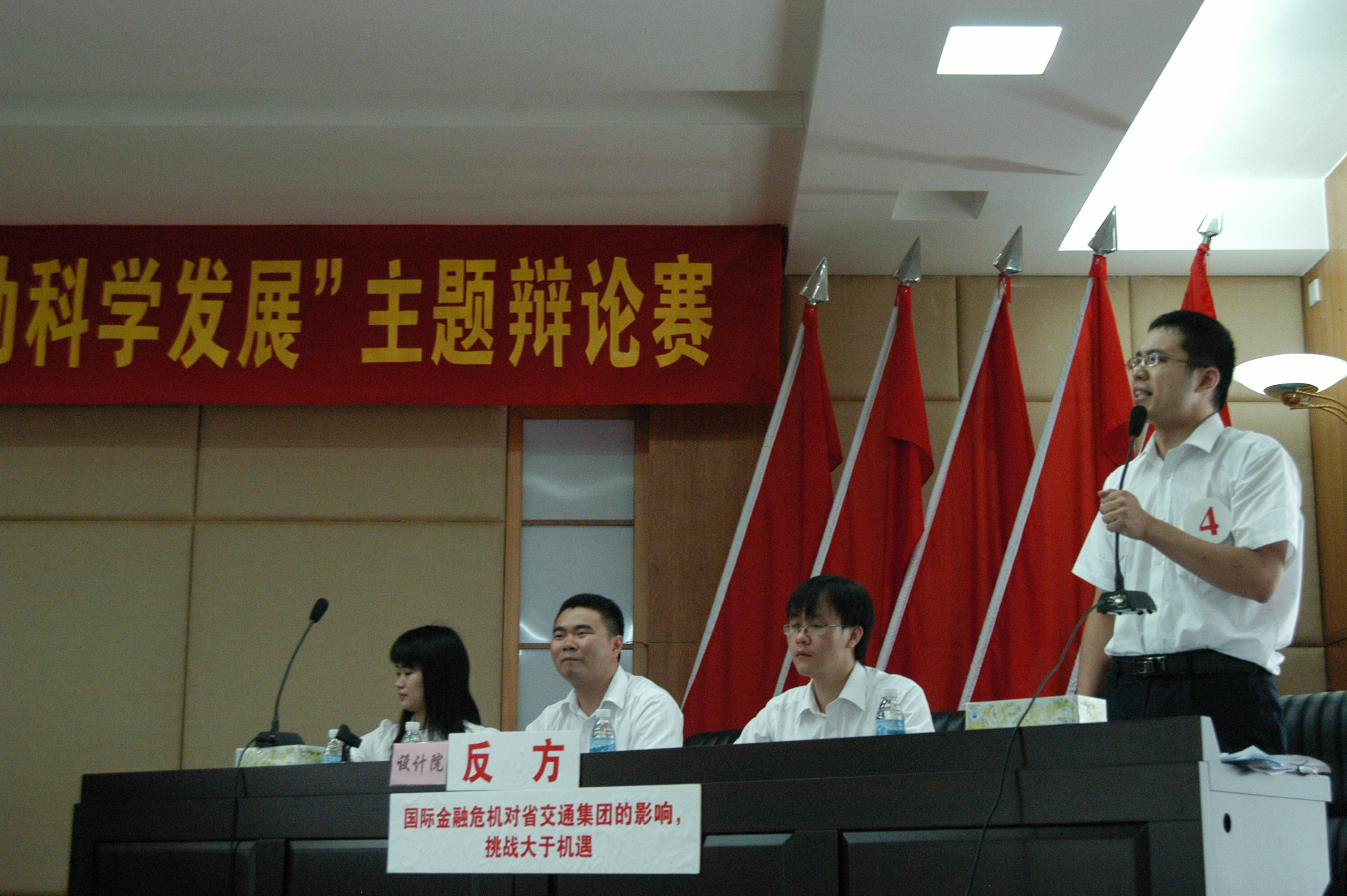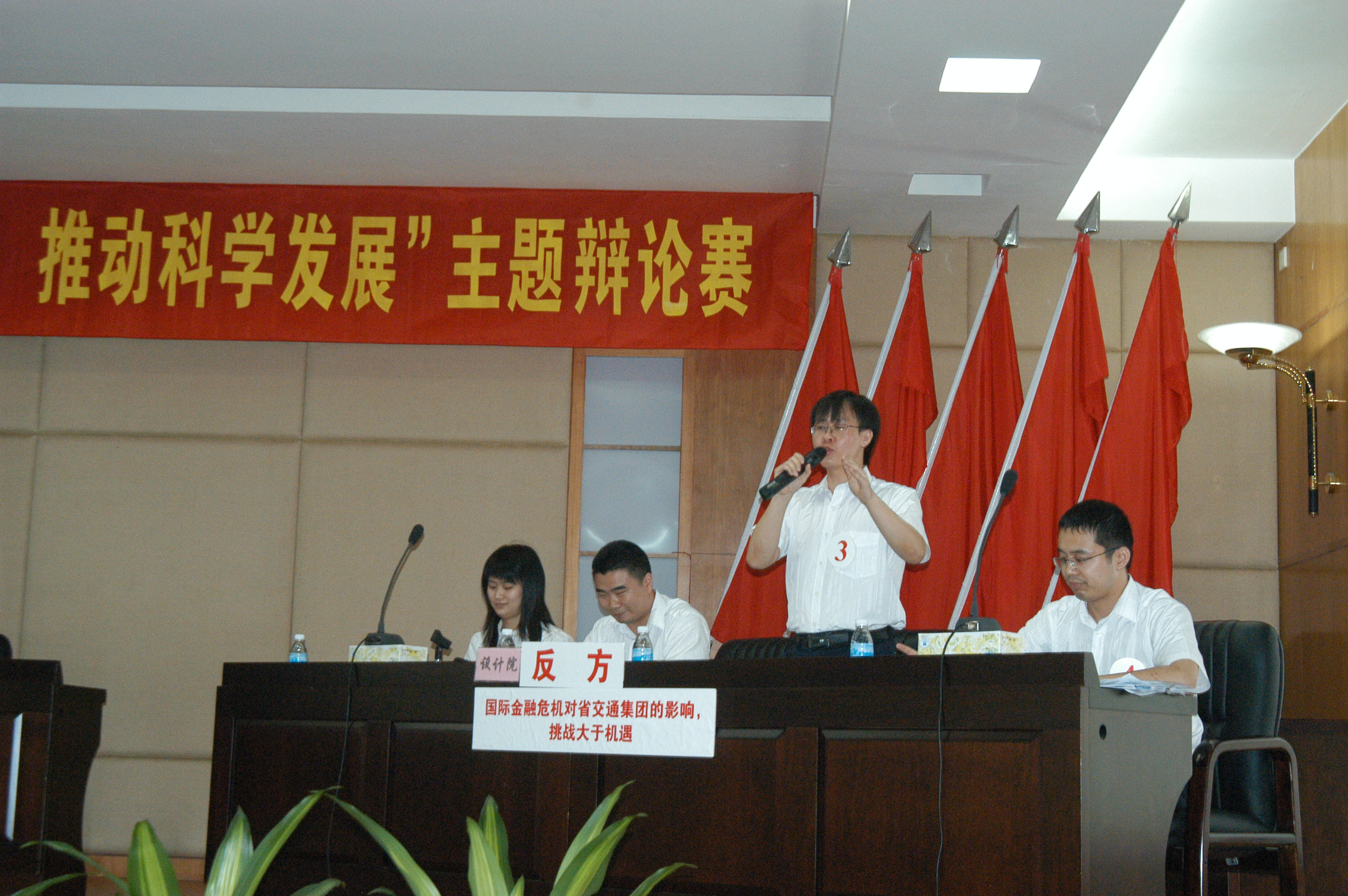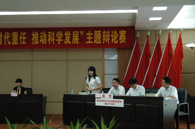 7月8日上午,由省交通集团组织的“勇挑时代重任,推动科学发展”主题辩论赛决赛在花都落下帷幕,我公司辩论队(决赛辩论队员周鑫、王一休、唐文、王玉文)舌战群儒,乘胜追击,最终摘得桂冠,荣膺一等奖! 此次比赛得到了公司领导及辩论队员所在部门的大力支持和关心,在为期两个多月的三轮比赛中,我公司队员充分体现“团队共进、竞争共赢、创新求精、奉献求真”的核心价值观,不畏艰难,愈战愈勇,最终取得了骄人的成绩,既充分展示了公司员工的聪明才智,也为公司赢得了集体荣誉。 特此报喜。 行政事务部