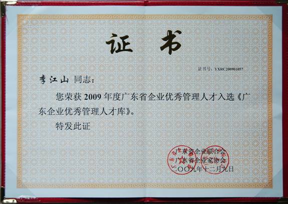 近日,在2009年广东省企业发展高峰论坛上,公司董事长、总经理李江山被评为“广东省企业优秀管理人才”,并入选《广东省企业优秀管理人才库》。 此次评选活动,由广东省企业联合会、广东省企业家协会发起和审核,全省共选出100名企业优秀管理人才。