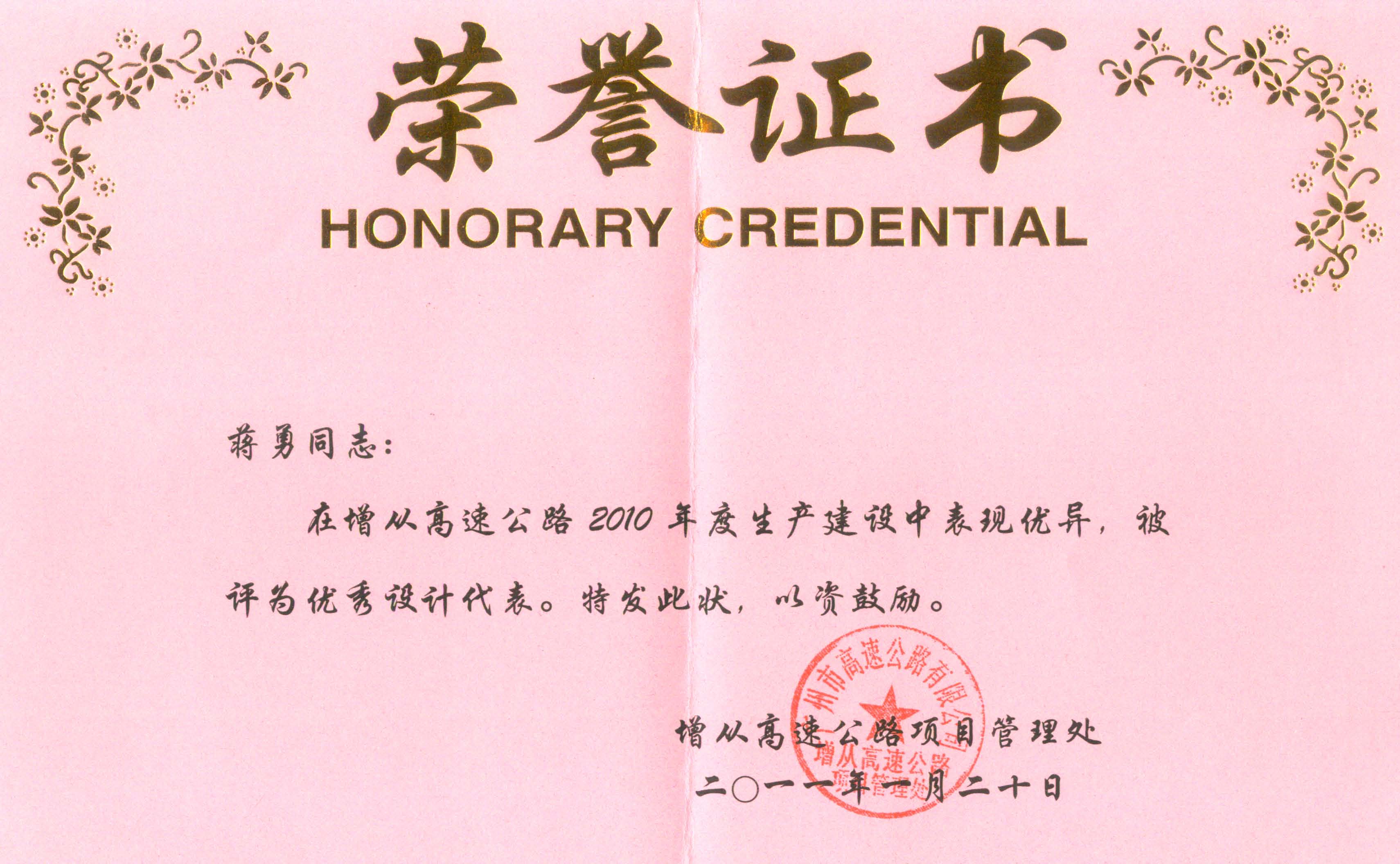 我司第四路桥设计部蒋勇同志在增从高速公路2010年度生产建设中表现优异,被广州市高速公路有限公司增从高速公路项目管理处评为“优秀设计代表”,为公司树立了良好的外部形象,赢得了荣誉,特此祝贺!