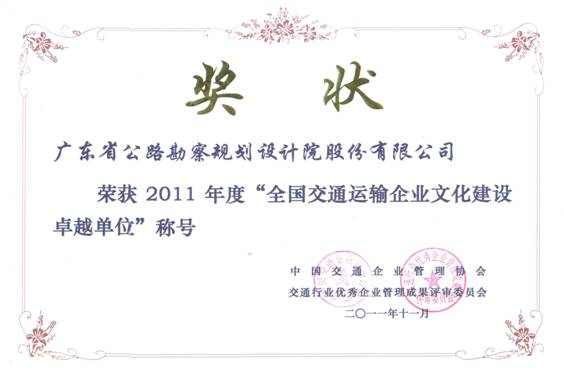 在11月12日召开的第六届全国交通运输企业文化建设高峰会上,我司继2009、2010年两次被评为“全国交通运输企业文化建设优秀单位”之后,再次荣获2011年度全国交通运输企业文化建设“卓越单位”称号。此奖项由中国交通企业管理协会评定,每年评选一次,今年全国共有160个单位获奖,其中品牌单位5家、卓越单位38家、优秀单位117家。