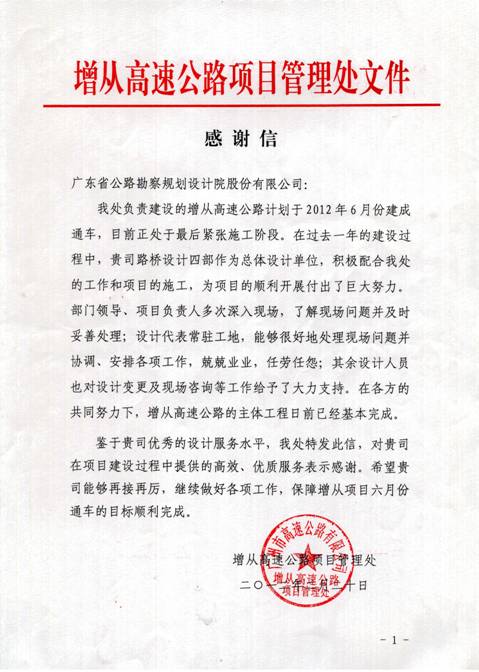 近日,增从高速公路项目管理处发来感谢信,对第四路桥设计部在增从高速公路建设中提供的“高效、优质”的设计后服务给予了充分肯定和高度赞扬。这是今年以来,我司设计后服务工作第三次受到业主单位来函表扬。特表祝贺!