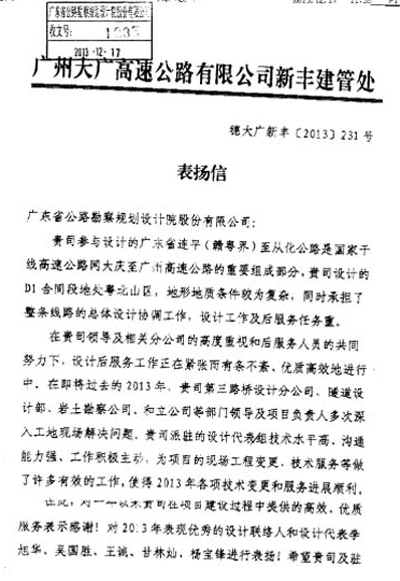 近日,广东二广高速公路有限公司连山管理处发来表扬信,对我司在二广高速连山段项目中提供的高效、优质服务表示赞扬,同时对负责该项目的第三路桥设计分公司等组织和个人给予了通报表扬。同期发来表扬信的还有大广高速连平至从化项目。特此报喜。