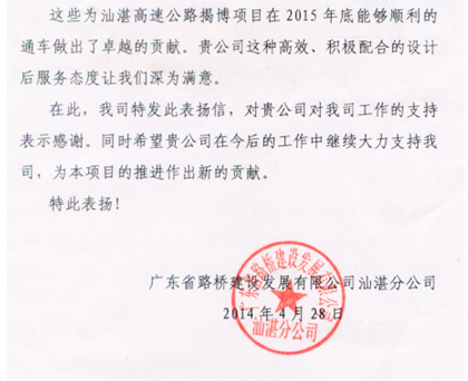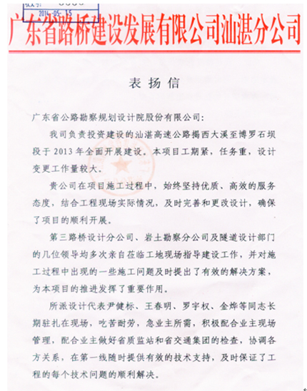 近日,省路桥建设发展有限公司汕湛分公司发来表扬信,对我司在汕湛高速公路揭西大溪至博罗石坝段项目中提供的优质、高效的设计后服务表示高度赞扬,对负责该项目的第三路桥设计分公司、岩土勘察分公司及隧道设计部,和尹健标、王春明等一批设计代表的工作表示感谢。特此报喜。