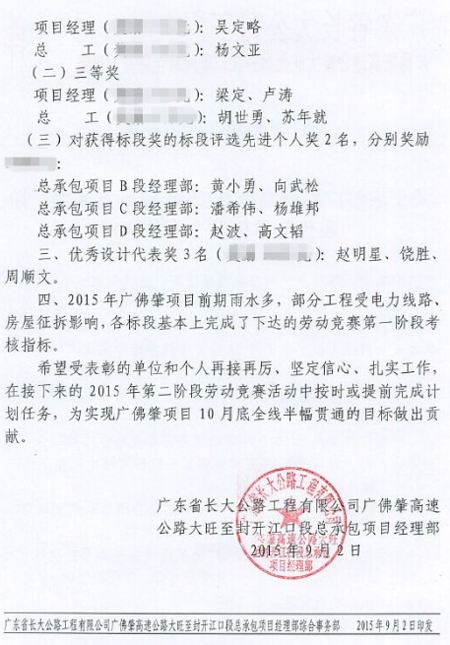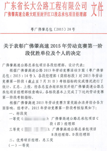 近日,我司岩土勘察分公司驻广佛肇高速公路肇庆大旺至封开江口段设计代表赵明星同志受到广东省长大公路工程有限公司广佛肇高速公路大旺至封开江口段总承包项目经理部表彰,荣获广佛肇高速2015年劳动竞赛“优秀设计代表”称号。
