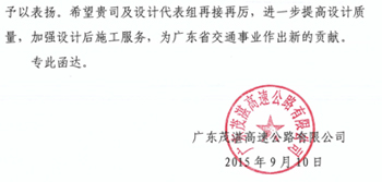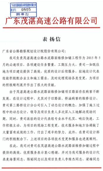 近日,广东省茂湛高速公路有限公司发来表扬信,对我司在茂湛高速公路水泥路面维修加铺工程中提供的高效、优质服务表示赞扬,同时对负责该项目的第三路桥设计分公司及项目负责人李维杰同志、梁雄同志、设计代表麦海景同志、陈韬同志给予了肯定和表扬,特此报喜。