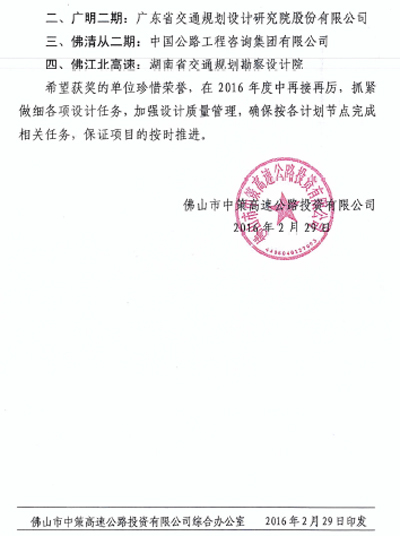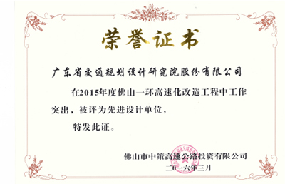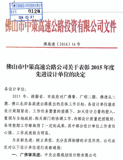 近日,佛山市中策高速公路投资有限公司授予公司“先进设计单位”荣誉称号,对我司在2015年度佛山一环高速化改造工程中的突出表现表示赞扬和肯定,负责该项目的第三路桥设计分公司表现突出,进一步树立了公司良好的品牌形象,特此报喜。