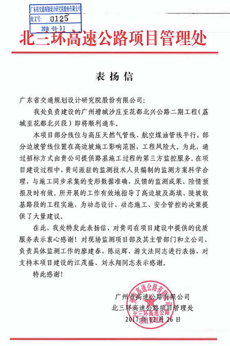 近日,北三环高速公路项目管理处发来表扬信,对我司在广州增城沙庄至花都北兴公路二期工程(荔城至花都北兴段)项目中提供优质服务表示肯定,对负责该项目的和立公司及其相关负责人江茂盛、刘永翔,技术人员廖建春、陈运辉、游文法给予了通报表扬,特此报喜!