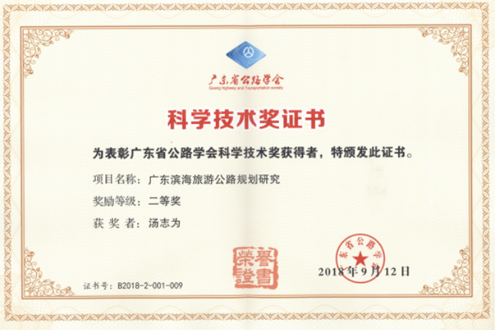 近日,从广东省公路学会传来喜讯,公司参与编制的“广东滨海旅游公路规划研究项目”荣获“2018年首届广东省公路学会科学技术奖"二等奖。李旭华、汤志为荣获个人奖。