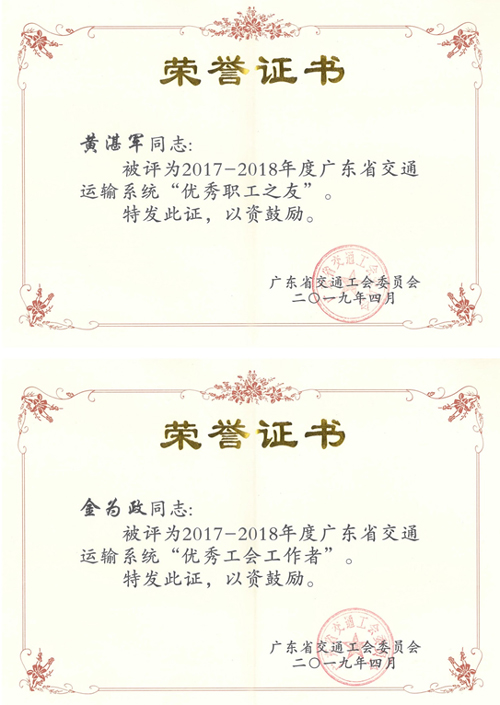 近日,我公司被广东省交通工会评为2017-2018年度广东省交通运输系统“先进女职工集体”;此外,我公司黄湛军总经理获评为2017-2018年度广东省交通运输系统“优秀职工之友”,金为政同志获评为“优秀工会工作者”,罗君同志获评为“优秀女职工”。 特此报喜!