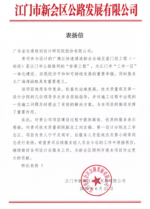 江门市新会区公路发展有限公司对我司在广佛江快速通道新会会城至崖门段工程(一标段)项目建设过程中提供的高效、优质服务表示了感谢,对参与该项目的技术质量部院副总工刘吉福、第一设计分院总工李志江、项目负责人宁平及周宇、设计后服务人员张庭杰及黎小顺等同志给予了通报表扬。