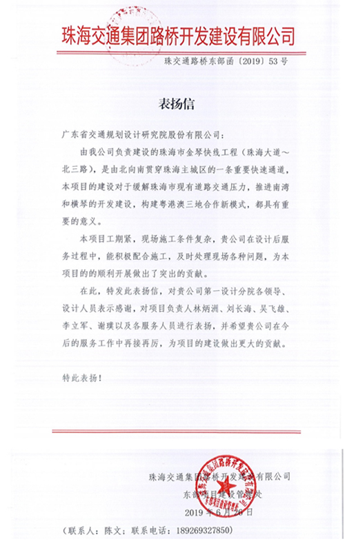 珠海交通集团路桥开发建设有限公司对我司在珠海市金琴快线工程(珠海大道~北三路)项目设计后服务过程中做出的突出贡献表示了肯定,肯定我司员工良好的职业素养与优秀的技术服务水平,对该项目的负责人林炳洲、刘长海、吴飞雄、李立军、谢璞以及各服务人员进行了表扬。