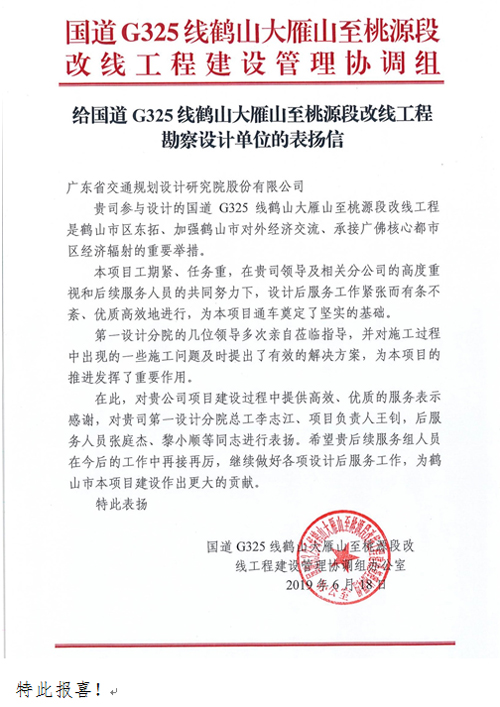 国道G325线鹤山大雁山至桃源段改线工程建设管理协调组对我司在国道G325线鹤山大雁山至桃源段改线工程项目建设过程中提供的高效优质的设计后服务表示了感谢,对我司第一设计分院总工李志江、项目负责人王钊、设计后服务人员张庭杰与黎小顺等同志给予了通报表扬。